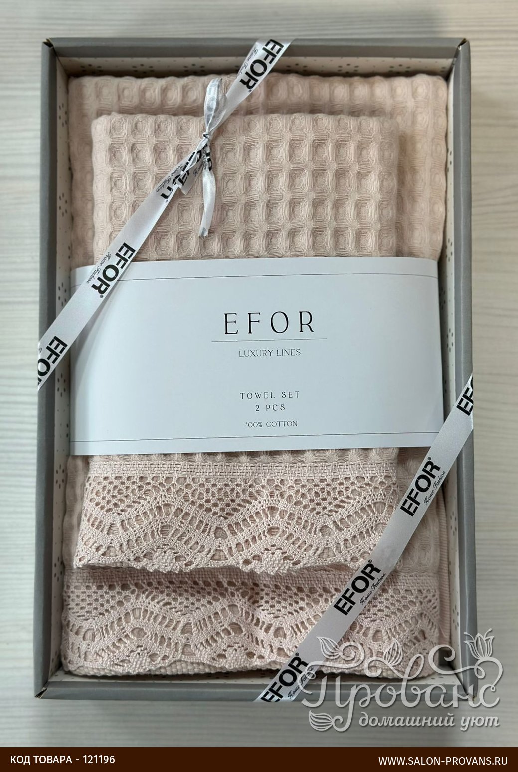 Подарочнная набор полотенец для ванной от турецкого бренда Efor. Полотенца изготовлены из 100% хлопковой вафли средней плотности, украшены гипюром. Ткань приятная на ощупь, хорошо впитывает влагу и быстро сохнет. Упаковка - подарочная коробка.