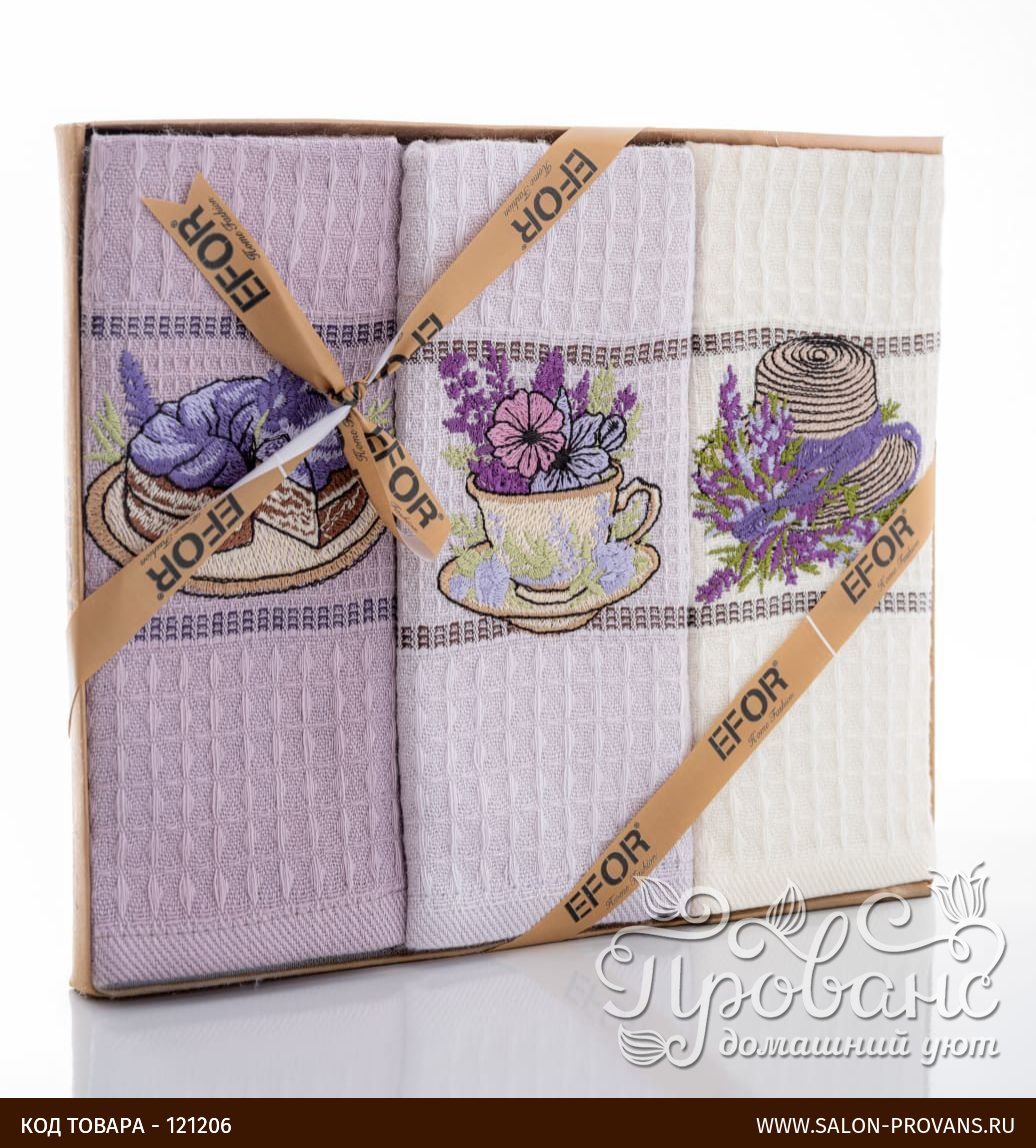 Подарочный набор из трёх полотенец для кухни от турецкого бренда Efor, украшенных симпатичной вышивкой. Полотенца изготовлены из 100% хлопковой вафельной ткани средней плотности, отлично впитывают влагу и быстро сохнут. Упаковка - подарочная картонная коробочка.