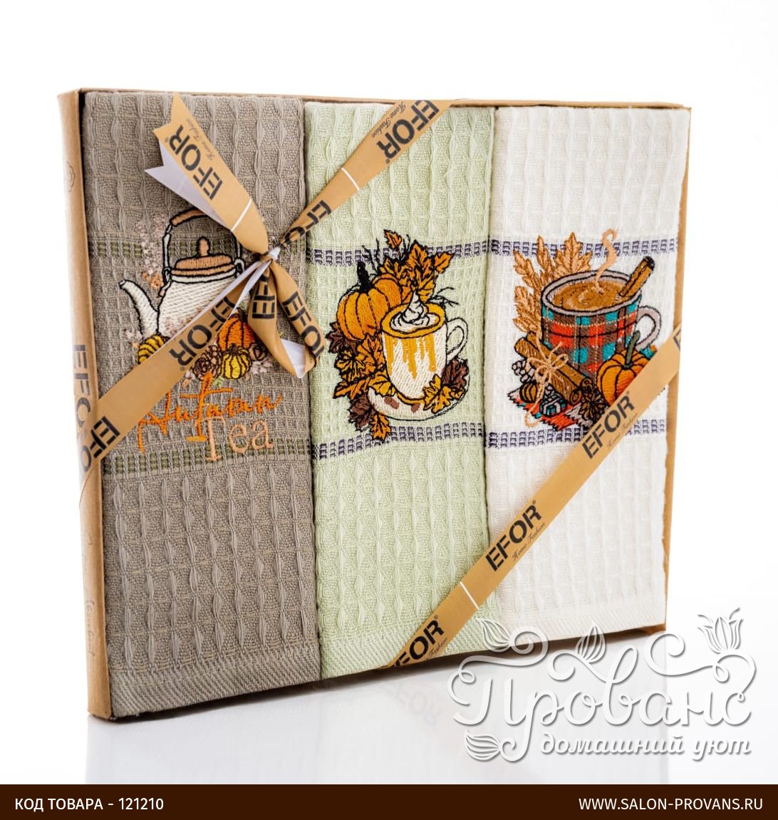 Подарочный набор из трёх полотенец для кухни от турецкого бренда Efor, украшенных симпатичной вышивкой. Полотенца изготовлены из 100% хлопковой вафельной ткани средней плотности, отлично впитывают влагу и быстро сохнут. Упаковка - подарочная картонная коробочка.