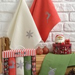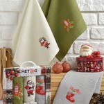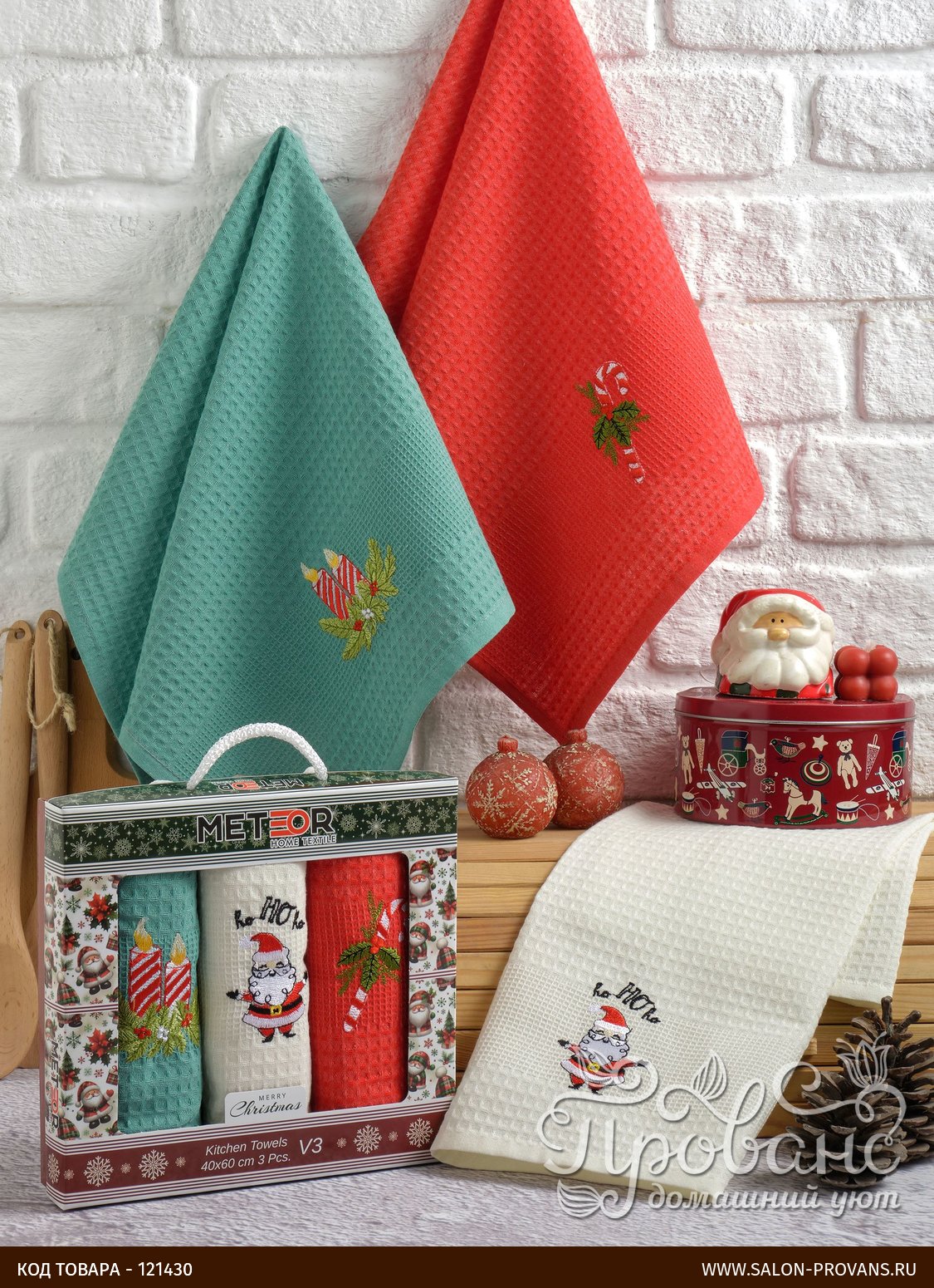 Подарочный набор из трёх кухонных полотенец от турецкого производителя Meteor. Полотенца изготовлены из качественной 100% хлопковой вафли, мягкой и приятной на ощупь, хорошо впитывающей влагу. Ткань украшена милой вышивкой.