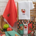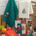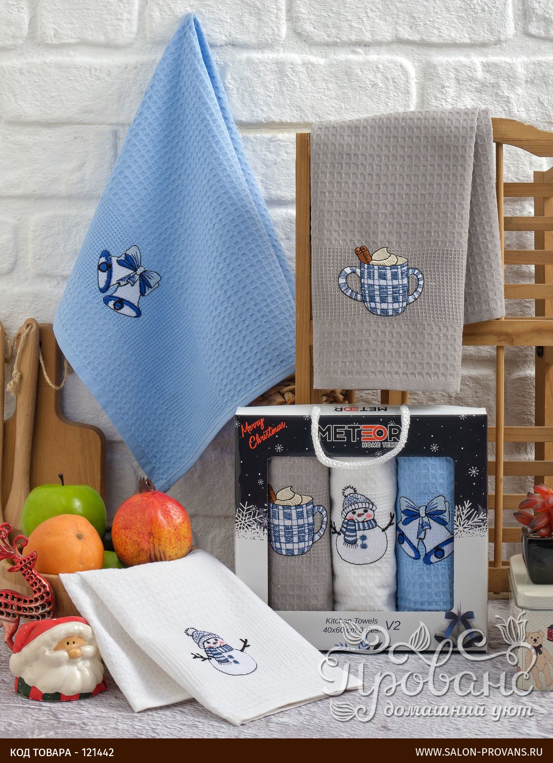 Подарочный набор из трёх кухонных полотенец от турецкого производителя Meteor. Полотенца изготовлены из качественной 100% хлопковой вафли, мягкой и приятной на ощупь, хорошо впитывающей влагу. Ткань украшена милой вышивкой.