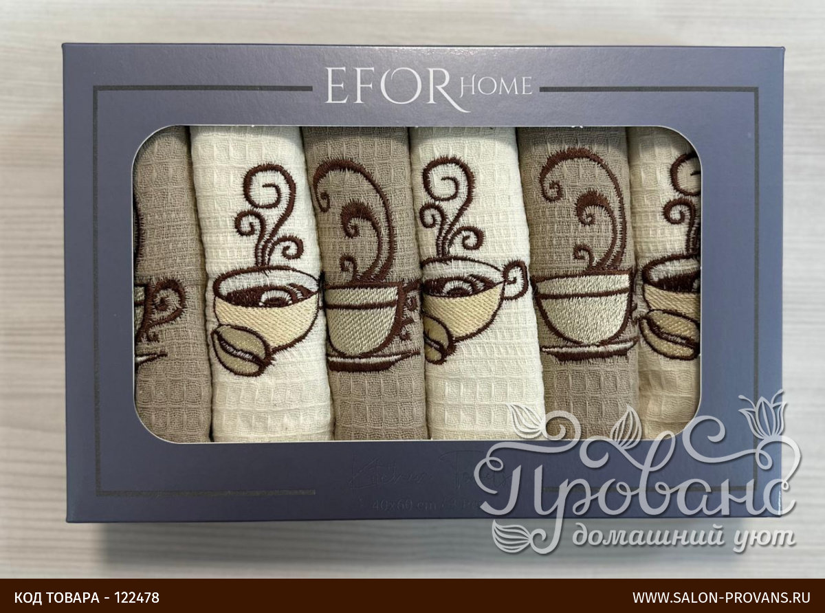 Подарочный набор из шести полотенец для кухни от турецкого бренда Efor, украшенных симпатичной вышивкой. Полотенца изготовлены из 100% хлопковой вафельной ткани средней плотности, отлично впитывают влагу и быстро сохнут. Упаковка - подарочная картонная коробочка.