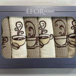 Подарочный набор из шести полотенец для кухни от турецкого бренда Efor, украшенных симпатичной вышивкой. Полотенца изготовлены из 100% хлопковой вафельной ткани средней плотности, отлично впитывают влагу и быстро сохнут. Упаковка - подарочная картонная коробочка.