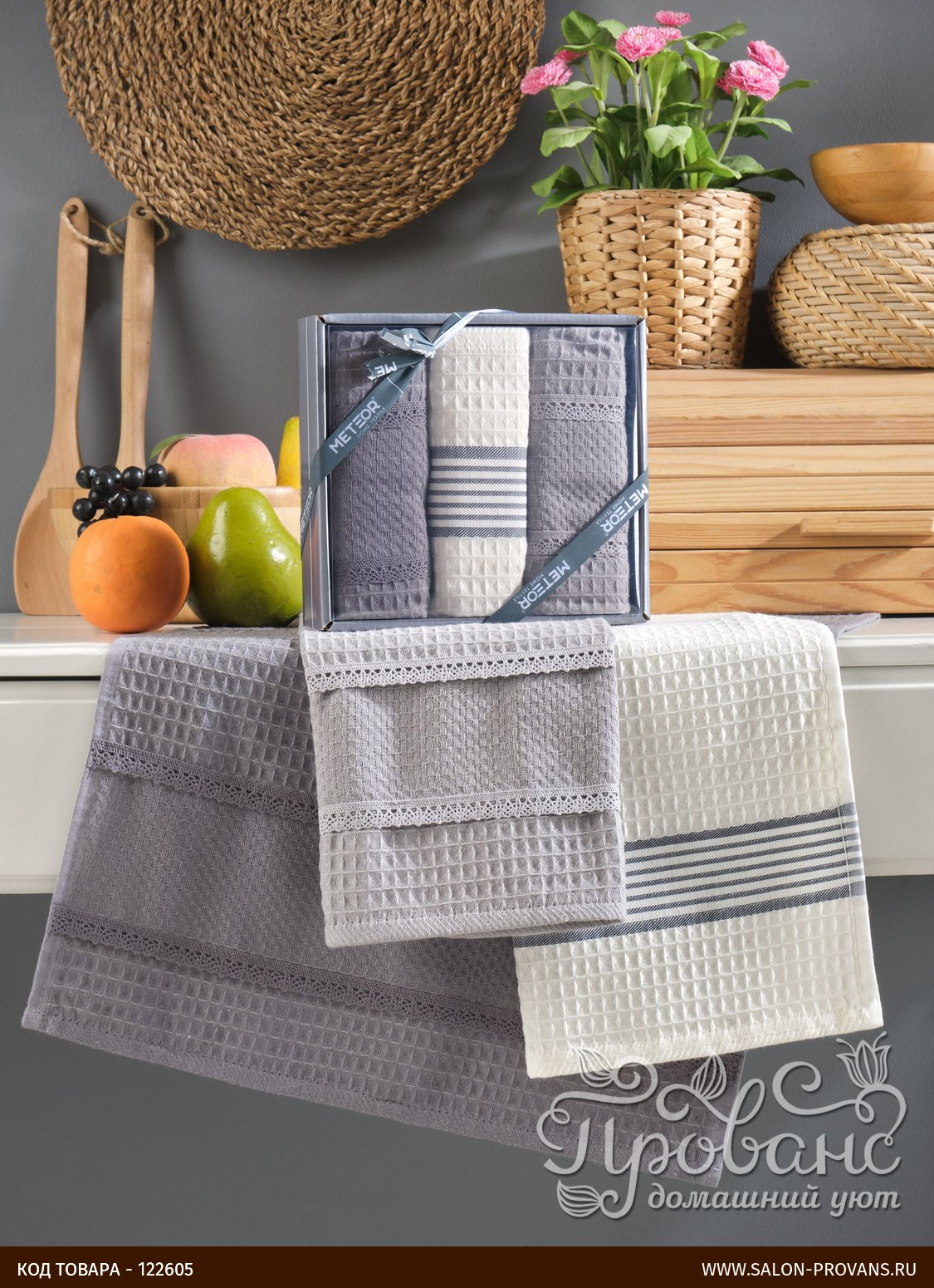 Подарочный набор из трёх кухонных полотенец из коллекции ARNICA от турецкого производителя Meteor. Полотенца изготовлены из качественной 100% хлопковой вафли, мягкой и приятной на ощупь, хорошо впитывающей влагу.