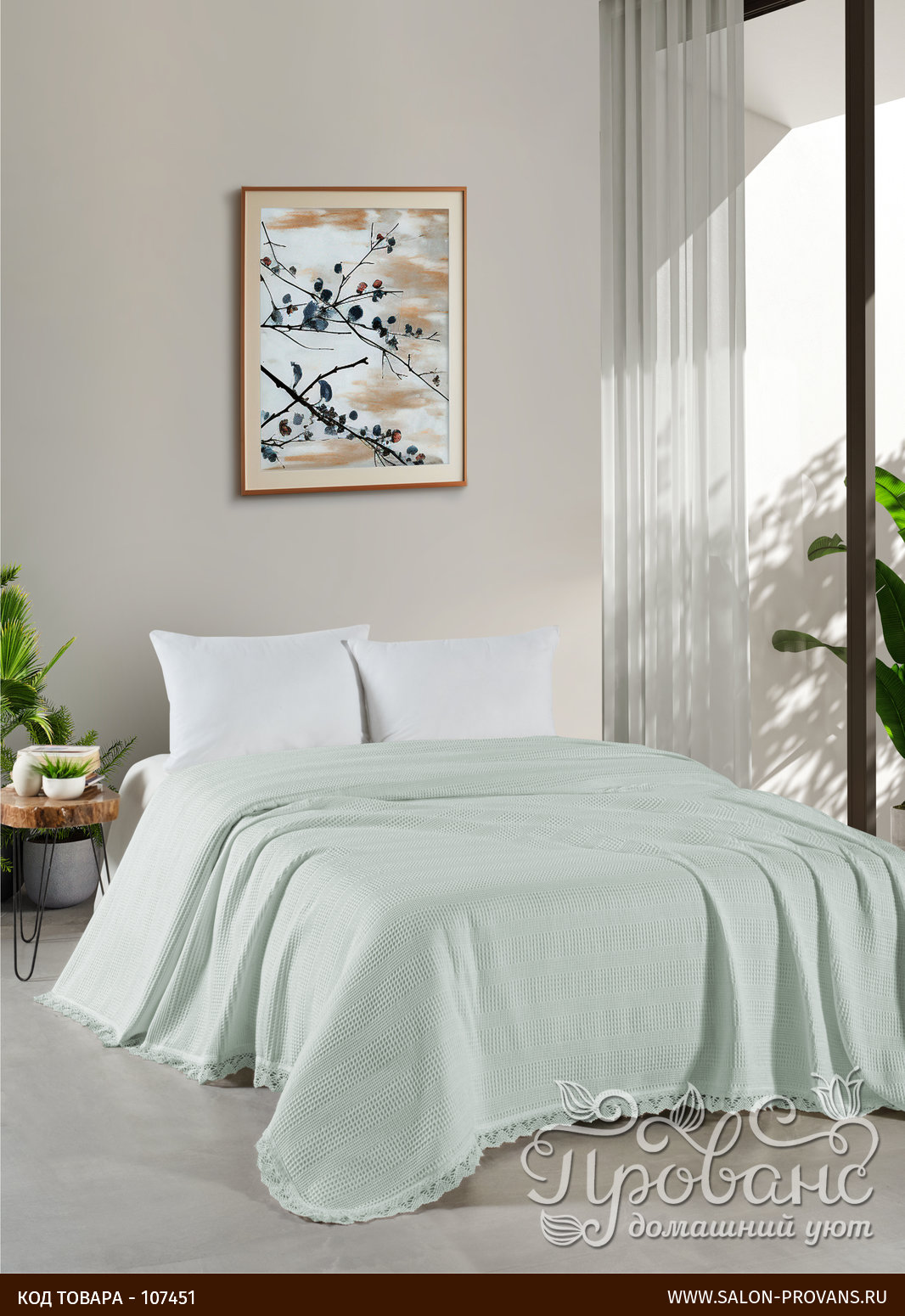 Вафельная однотонная простынь-покрывало от известного премиального турецкого бренда DO&CO. Может использоваться как покрывало и как лёгкое летнее одеяло. Изготовленая из 100% хлопка, мягкая и приятная на ощупь, украшенная легким гипюром. Упаковка — ПВХ