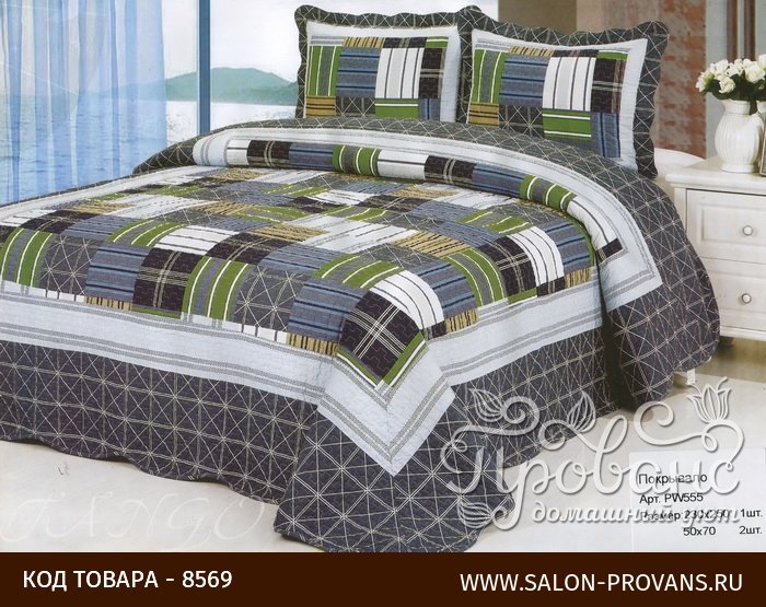 Покрывало в стиле пэчворк делает комнату уютнее и интереснее. Сама лоскутная техника - это своеобразная мозаика из разных по фактуре и форме фрагментов ткани. Данная модель домашнего текстиля имеет орнамент, называемый "быстрые квадраты", основанный на комбинации лоскутов квадратной формы. Сдержанная цветовая гамма и геометрия мотивов позволяет использовать такой домашний текстиль как в женской, так и мужской спальне. Окаймляет лоскутный мотив интересный орнамент из небольших темно-серых квадратов. Эффектный домашний текстиль придаст комнате оригинальный вид и станет заметной деталью интерьера спальни.