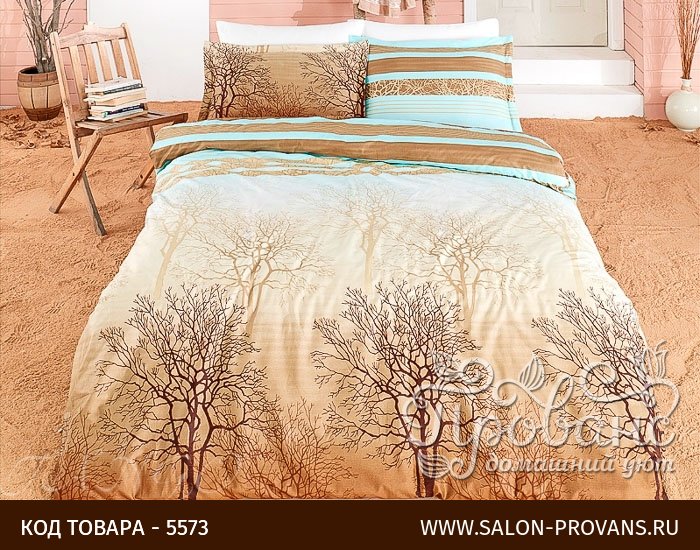 Природная тематика всегда органично смотрелась в интерьере жилых помещений, поэтому дизайнеры предлагают все новые варианты использования ее в декоре помещения. Комплект постельного белья с деревьями в песочно-бежевых тонах с бирюзовой отделкой принесет в интерьер частицу живой энергии, частицу природы. Дерево является символом жизни, роста и развития, потому его изображения все чаще можно увидеть в домашних интерьерах. Чередование бирюзовых и золотых горизонтальных полос вносят разнообразие в спокойную цветовую гамму и придают набору своеобразную изюминку.
