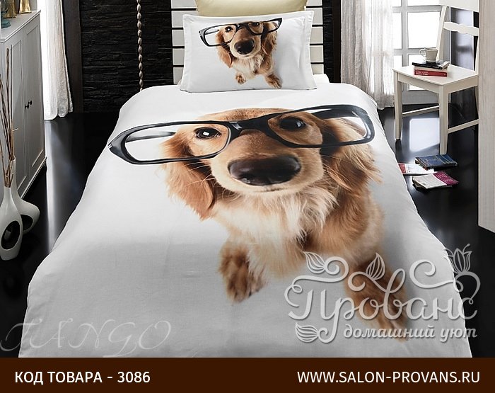 Белое постельное белье, на котором нарисован забавный пес в очках – задорный и милый аксессуар для спальни. Это белье можно назвать минималистским – оно лаконично и не содержит в себе лишних украшательств. Белая ткань и светло-коричневый пес – эффектная картинка, которая придется по вкусу всем любителям такого стиля.