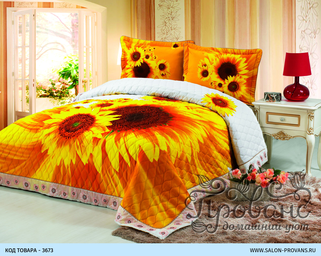 Покрывало с крупными подсолнухами – это то, что нужно, чтоб создать в спальне уютную, радостную и праздничную атмосферу. Пышные жёлтые цветы словно освещают комнату солнцем – такой текстиль визуально согреет помещение даже в ненастный осенний день. Подсолнухи, символизирующие радость и волю к жизни, тронут сердца любителей флористической тематики.