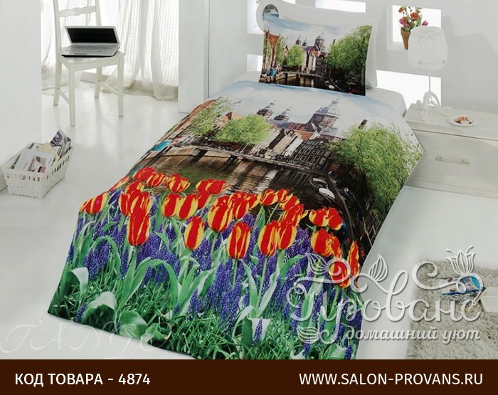 Постельное белье с тюльпанами - особый подарок тем, кто любит путешествовать, потому что изображение на ткани переносит нас в Голландию, страну цветов и каналов. На фоне архитектурных и исторических памятников красно-желтые тюльпаны и синие дельфиниумы смотрятся так живо и естественно. Эффект перспективы, здания, деревья рядом с ними, позволяют визуально раздвинуть пространство. Комплект выполнен в урбанистическом стиле. В нем прекрасно сочетаются вместе и рукотворные памятники и естественная красота природы.