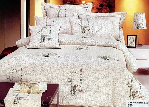 Белое постельное белье с изображением бамбуковых побегов придется по душе любителям азиатского минимализма в интерьере. Если вы хорошо чувствуете себя в окружении неярких красок и природных мотивов – смело делайте выбор в пользу этой модели. Белая ткань с деликатными черными, зелеными и красными акцентами дополнительно украшена мелким узором и вязью иероглифов.