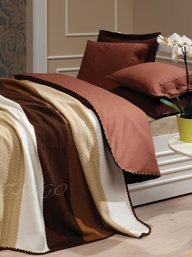 Великолепный комплект постельного белья коричневого оттенка. Цвет, близкий к шоколадному, внесёт новшество в вашу спальную комнату. Этот набор имеет в комплекте плед в полоску более светлых цветов. Изумительный глянец материала придает вашей постели королевский шик. Лёгкий контраст цветов и параллельные полосы на первый взгляд очень просты, но на деле выглядят изумительно. Этот комплект создаст незабываемый уют в вашей спальной комнате.
