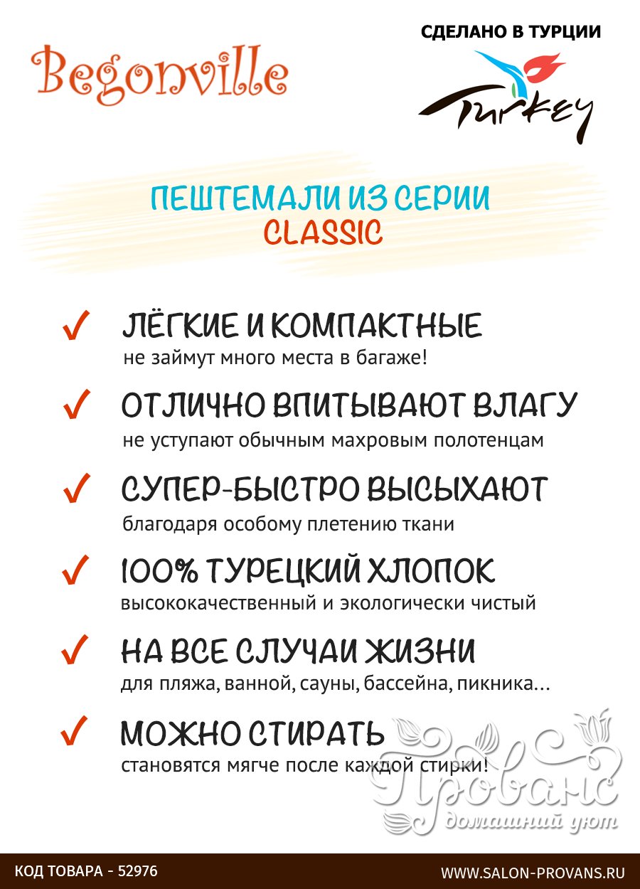 Традиционное турецкое полотенце пештемаль из коллекции CLASSIC от известного турецкого бренда Begonville. Пештемаль можно использовать как накидку, палантин, пляжное полотенце, брать с собой в сауну, хамам или бассейн. Ткань изготовлена из 100% турецкого хлопка, сертифицированного GOTS. Она лёгкая, гладкая с обеих сторон и приятная на ощупь, прочная и быстро сохнущая (идеально для пляжа!). С каждой стиркой пештемаль становится всё мягче и мягче! Рисунок на ткани не напечатан, а выполнен с помощью жаккардового переплетения разноцветных нитей, окрашенными экологически чистыми красителями. По коротким краям полотенце украшено длинными кисточками, сделанными вручную. Упаковка — ПВХ пакет.