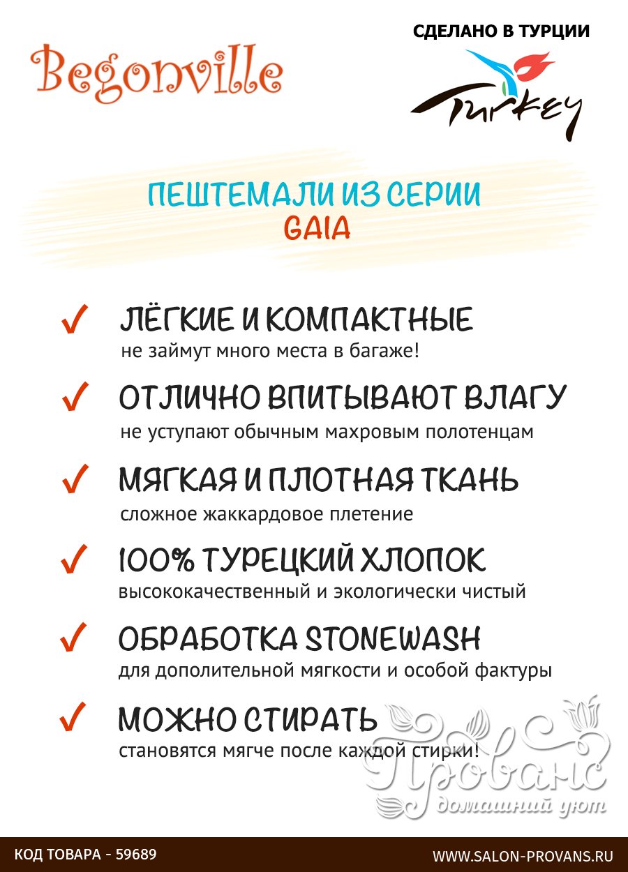 Begonville — это бренд турецкой фабрики Santis Tekstil, основанной в 1974 году в городе Денизли, которая специализируется на производстве традиционных турецких полотенец пештемалей. Полотенца Begonville отличаются высоким качеством и совмещают в себе как современные текстильные технологии, так и элементы традиционной ручной работы. Благодаря большому разнообразию дизайнов и тканей, каждый сможет найти пештемаль Begonville на свой вкус!