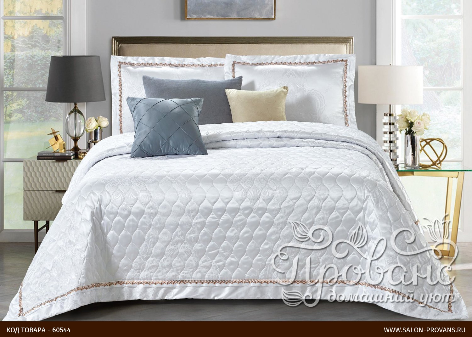 Шикарное стёганое покрывало от российского бренда Tango, изготовленное из жаккарда (65% хлопок, 35% вискоза). В комплекте идут две наволочки в дизайне покрывала. Упаковка - фирменный картонный чемоданчик.