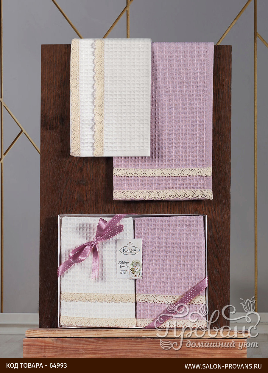 Подарочный набор полотенец для кухни KOPENAKI от турецкого бренда Karna, украшенных изящным гипюром. Полотенца изготовлены из 100% хлопковой вафельной ткани средней плотности, отлично впитывают влагу и быстро сохнут. Упаковка - подарочная картонная коробочка.