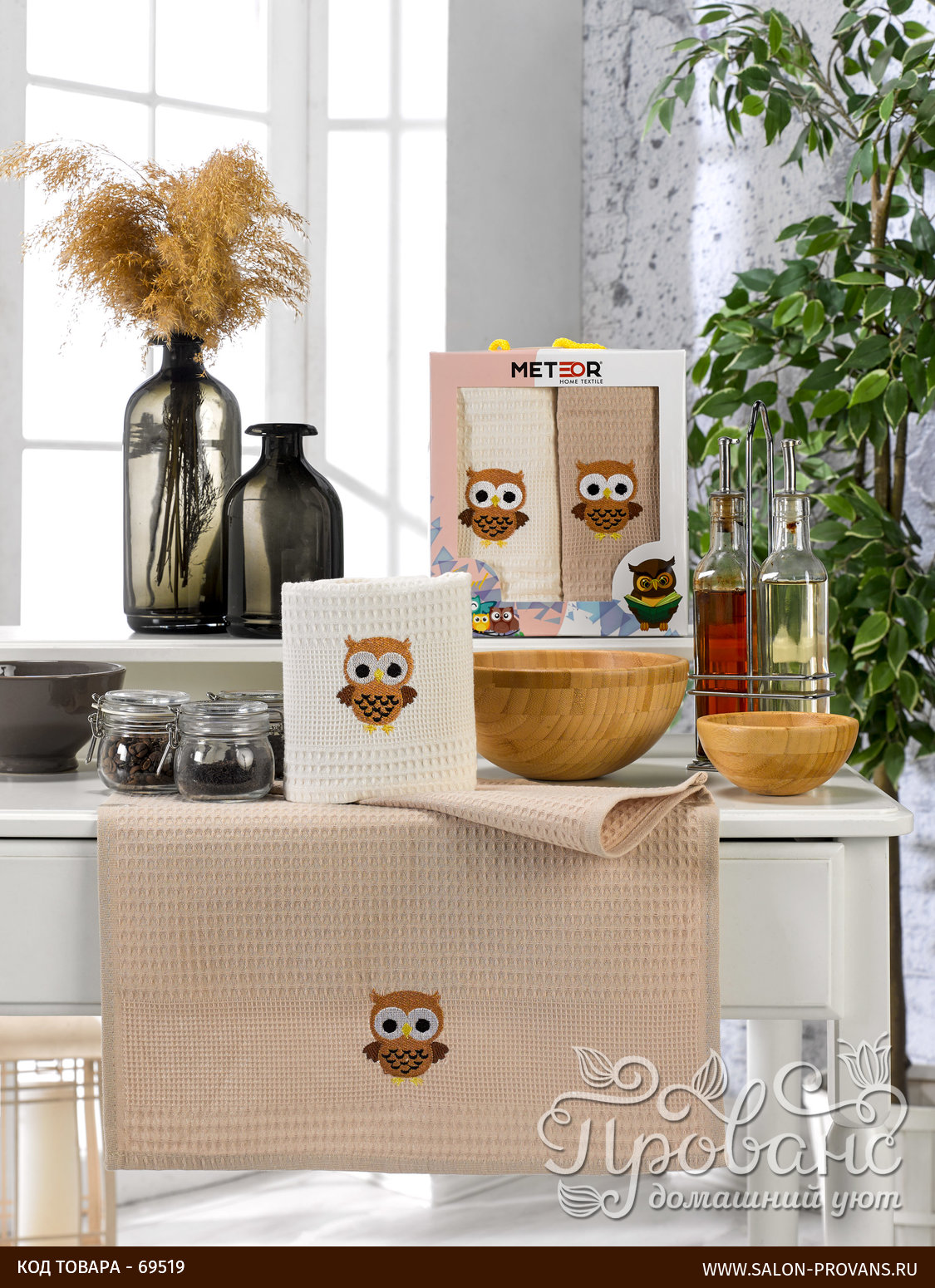 Подарочный набор полотенец для кухни 40х60(2) Meteor BIONCE хлопковая вафля сова