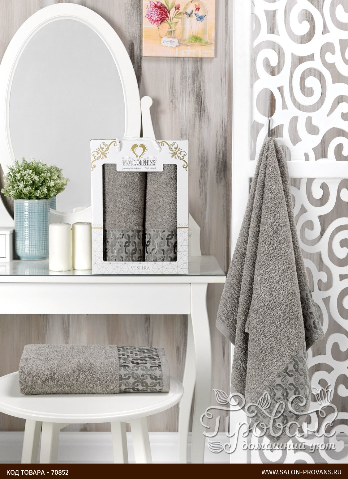Подарочный набор полотенец для ванной из коллекции VESPIRA от крупнейшего турецкого производителя Two Dolphins. Полотенца изготовлены из качественной 100% хлопковой махры высокой плотности, мягкой и приятной на ощупь, хорошо впитывающей влагу. Ткань украшена жаккардовым орнаментом.