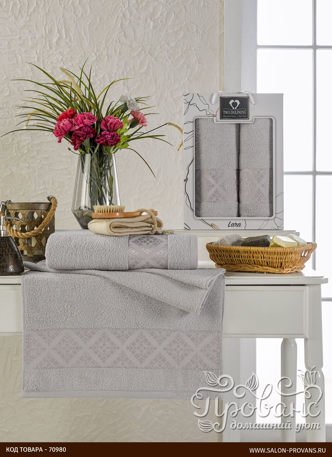 Подарочный набор полотенец для ванной из коллекции LARA от крупнейшего турецкого производителя Two Dolphins. Полотенца изготовлены из качественной 100% хлопковой махры высокой плотности, мягкой и приятной на ощупь, хорошо впитывающей влагу. Ткань украшена жаккардовым орнаментом.